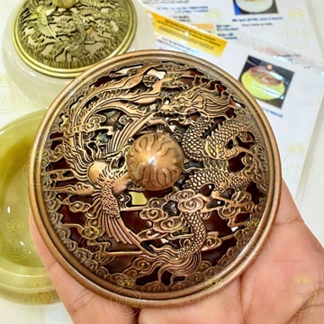 Nắp lư làm từ đồng đúc dày, hoàn thiện tinh xảo với họa tiết Long – Phụng đan xen, tạo chiều sâu nghệ thuật và điểm nhấn thẩm mỹ nổi bật. Các khe thoát khói được bố trí khéo léo, giúp hương trầm lan tỏa đều, nhẹ và ổn định trong không gian.