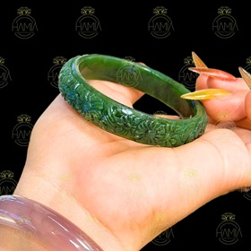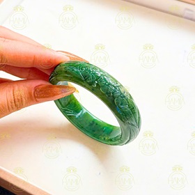 hiện lên như tuyệt tác được khắc tạc từ linh khí núi rừng. Sắc ngọc xanh biếc, mướt mát như chồi xuân non, chạm trổ thủ công tinh xảo, mang hồn cốt phương Đông cổ kính. Mỗi đường nét là một lời chúc lành – phú quý, bình an, trường thọ. Đeo vòng không chỉ để đẹp, mà là mang theo mình cả một mạch văn hóa, một lớp phù sa phúc đức từ ngàn xưa.
